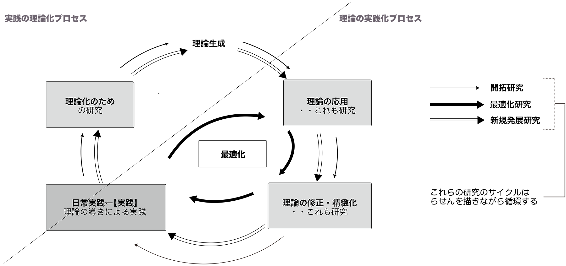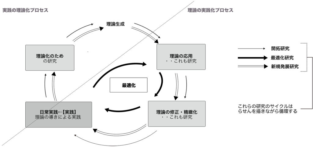 ですから、グレーザーとストラウスのGTA(Grounded Theory Approach)から、木下が考案し、発展させたM-GTA(Modified-Grounded Theory Approach:修正版グラウンデッド・セオリー・アプローチ)は、もともと、現場から理論を生み出し、その理論を日常実践に活用する、そこからまた新たな理論化のための研究が生まれる、といった、実践と理論のサイクルを目指していました。(参照 木下2020: 318図11-3 M-GTAにおける実践と理論のらせん的三重サイクル図)